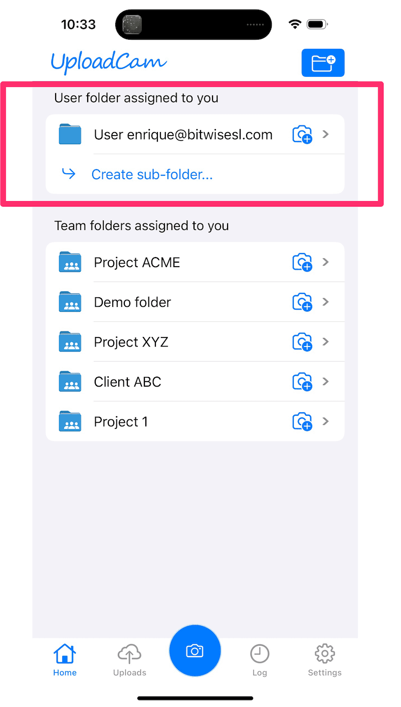 UploadCam allows you to set up a dedicated folder for each user in your staff within your main company folder. This becomes the default folder for each user, visible to them directly in the UploadCam mobile app. Users can upload photos directly into this folder and they can also create subfolders inside of it.