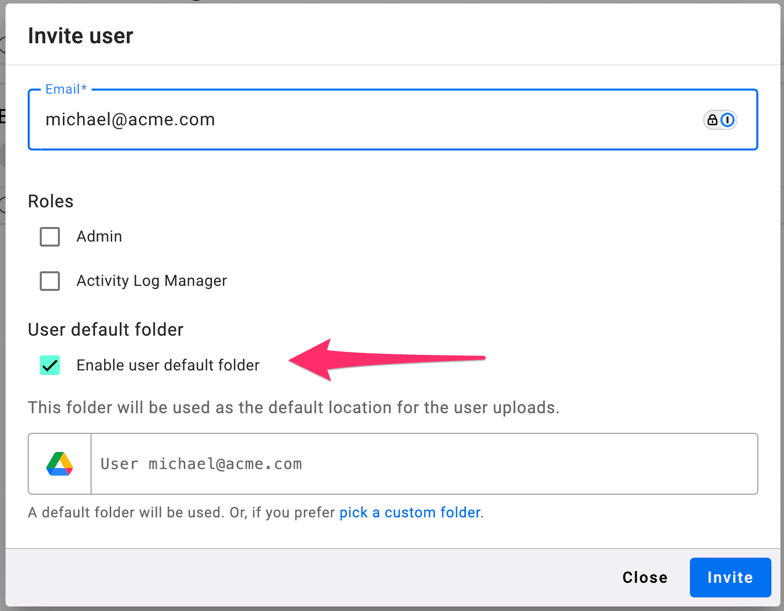 To assign a default folder to your users you can check the box "Enable user default folder" when you invite a new user:
