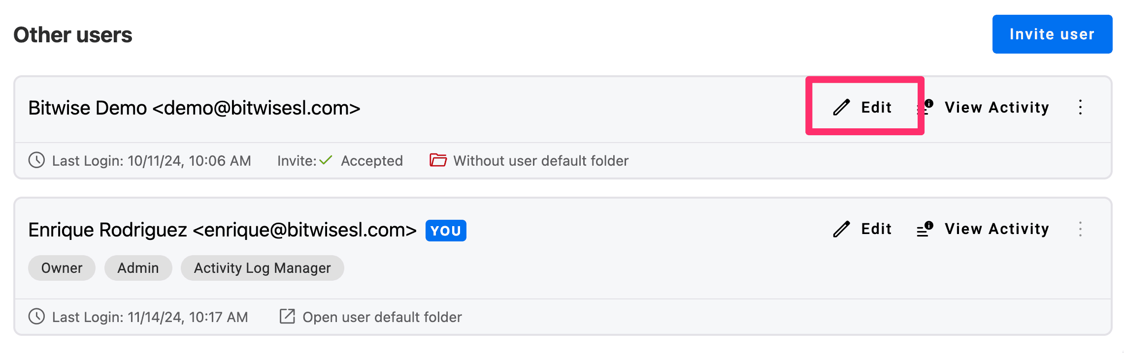 If you have existing users without a default folder, you can click the 'Edit' button in the listing of users in the Team screen and enable the default folder for them: